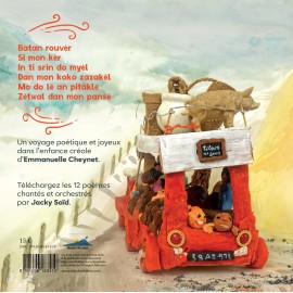 12 poèmes (fonnker), en créole réunionnais, de l’autrice Emmanuelle Cheynet nous faisant déguster ses délicieux souvenirs d’enfance. On se replonge dans ce qui nous faisait vibrer enfant tout autour de chez nous. Ces textes sont mis en musique par Jacky SAID un compositeur et musicien réunionnais de talent, il en ressort des chansons en séga ou maloya destinées aux enfants. Les poèmes sont chaque fois illustrés par Claire RUIZ qui a créé pour l’occasion des personnages en pâte à modeler.